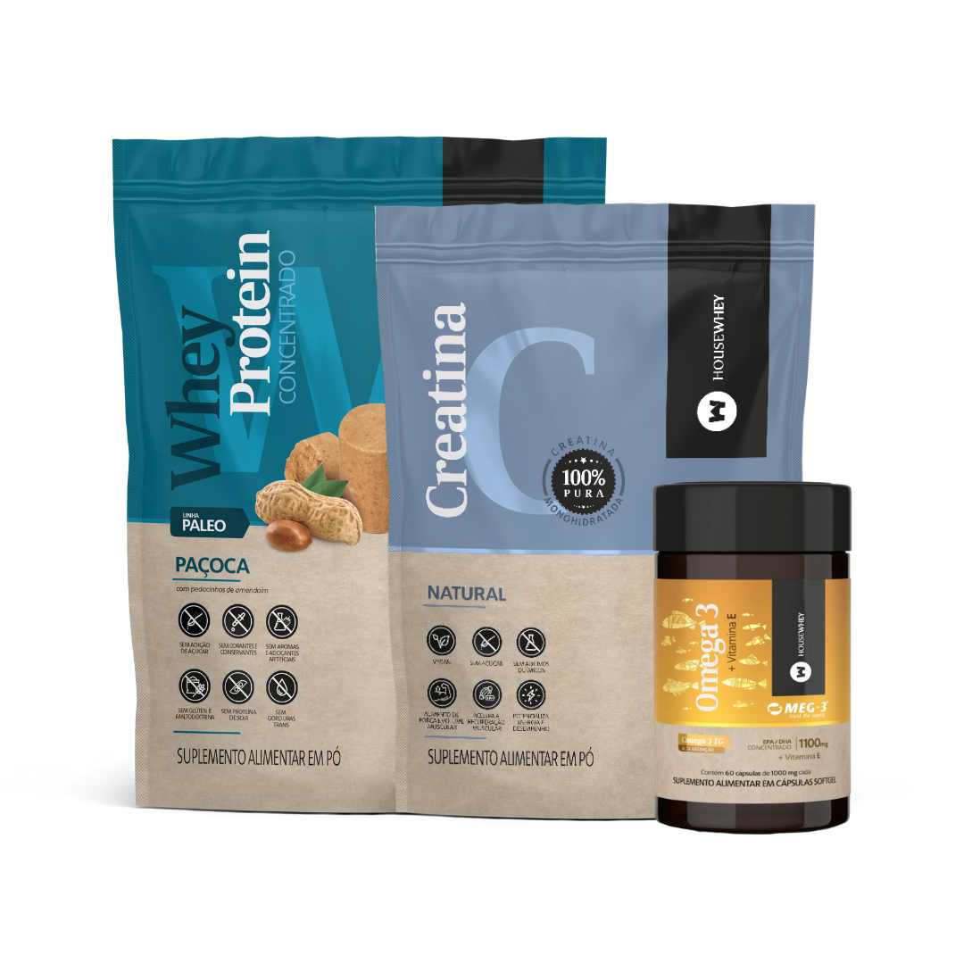 Composto por Whey Protein Concentrado sabor Paçoca (900g), Ômega 3 de alta concentração e Creatina 100% Pura, este combo oferece nutrição completa para corpo e mente, potencializando seus treinos e sua saúde.