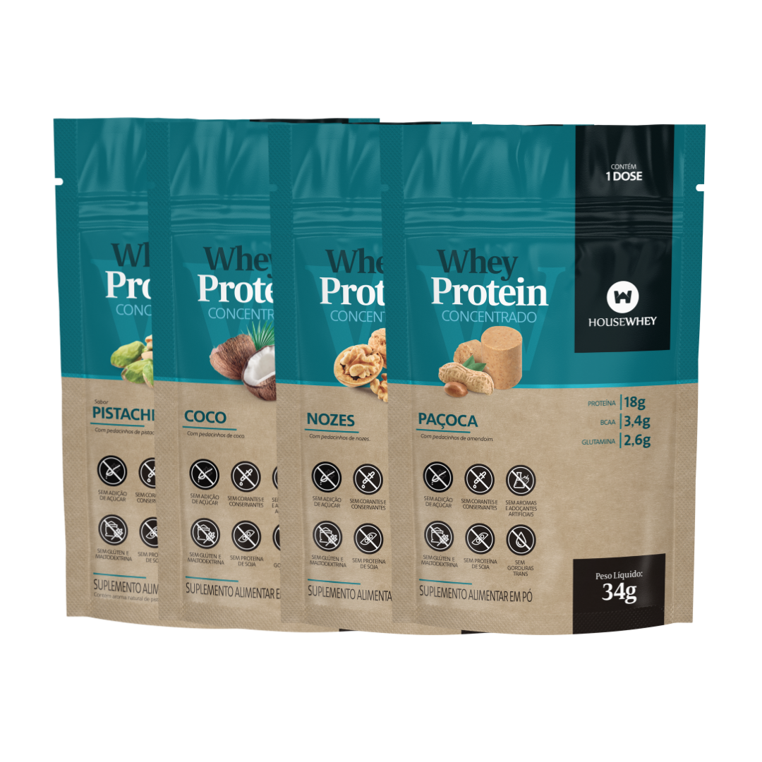 Sachês individuais de Whey Protein Concentrado Nozes: Ingredientes: Proteína concentrada do soro do leite, nozes, adoçantes naturais (estévia e taumatina) e lecitina de soja.