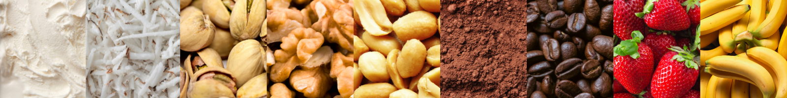 Baunilha, Paçoca, Banana com Canela, Café com Leite, Natural, Nozes, Coco e Pistache.